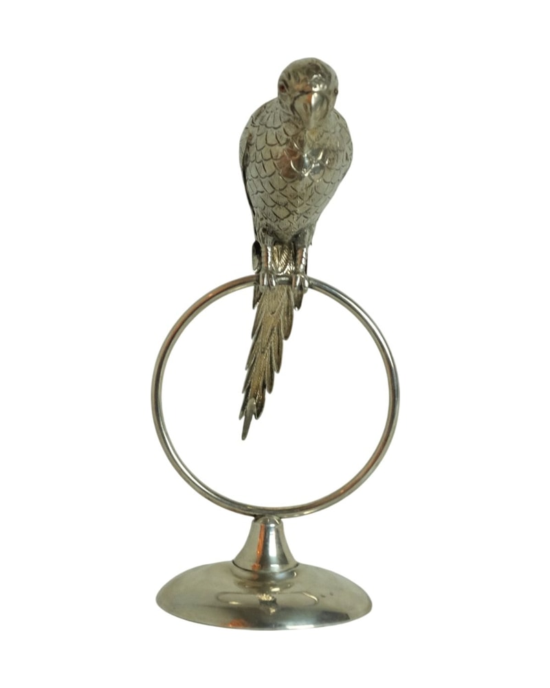 Porta tarjetas de plata con la figura de un loro en la parte superior. El loro presenta un acabado detallado con escamas y un diseño elegante. La base es circular y proporciona estabilidad. Este objeto es funcional y decorativo, ideal para exhibir en un escritorio o mesa. Presenta un brillo característico de la plata.