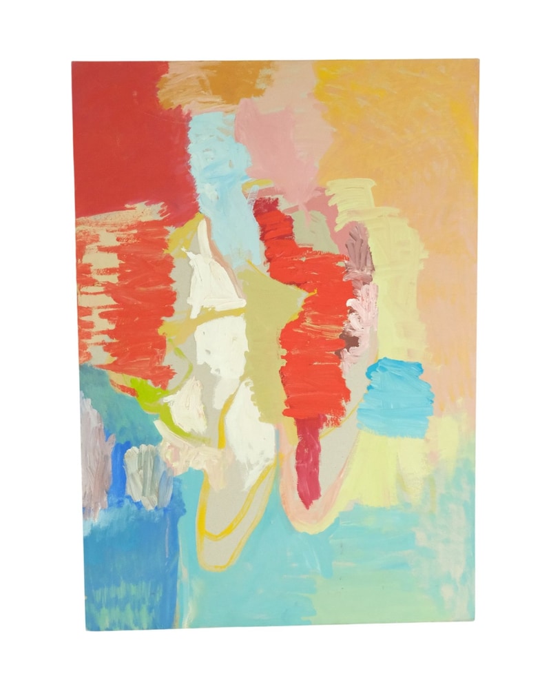 Pintura abstracta del siglo XX que presenta una combinación de colores vibrantes y formas fluidas. La obra está realizada en óleo sobre lienzo, mostrando una técnica de pinceladas sueltas y dinámicas. No se observan firmas o marcas visibles. El lienzo está montado sobre un marco de madera, asegurando su durabilidad. La composición utiliza una variedad de tonos, incluyendo rojos, azules y amarillos, creando un efecto visual atractivo.