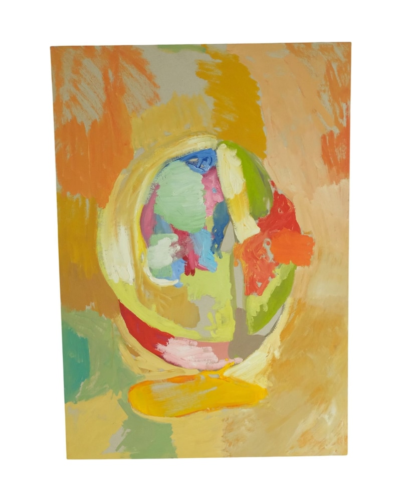 Pintura abstracta en óleo sobre lienzo que presenta un globo terráqueo en colores vibrantes. La obra muestra una paleta de tonos cálidos y fríos, con un enfoque en formas redondeadas y texturas suaves. Se observa un uso expresivo del color y la técnica de pinceladas sueltas. La parte superior presenta un pequeño desgaste en la esquina, pero la obra en general se encuentra en buen estado.