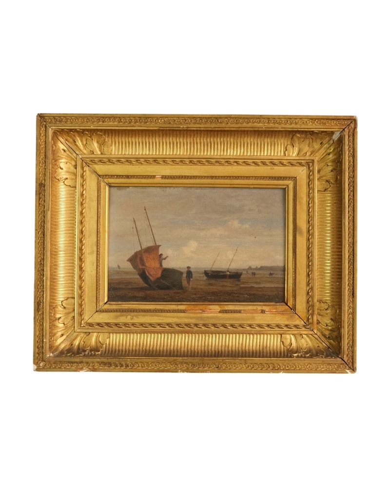 Cuadro del siglo XIX que representa un paisaje marítimo con barcos en la orilla. La obra muestra un marinero junto a una embarcación de vela. El marco dorado presenta detalles decorativos y tiene signos de uso. La pintura está en un estado visible de conservación, con algunas marcas en el marco. No se observan firmas o marcas del artista.