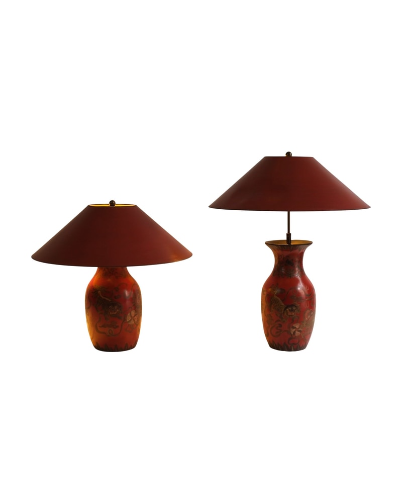 Conjunto de dos lámparas de mesa en cerámica roja con detalles decorativos. Una lámpara presenta un diseño en forma de jarra, mientras que la otra tiene un cuerpo más redondeado. Ambas cuentan con pantallas de color rojo. Los motivos decorativos incluyen figuras y patrones en dorado. Las lámparas están en condiciones funcionales y presentan un estilo contemporáneo.