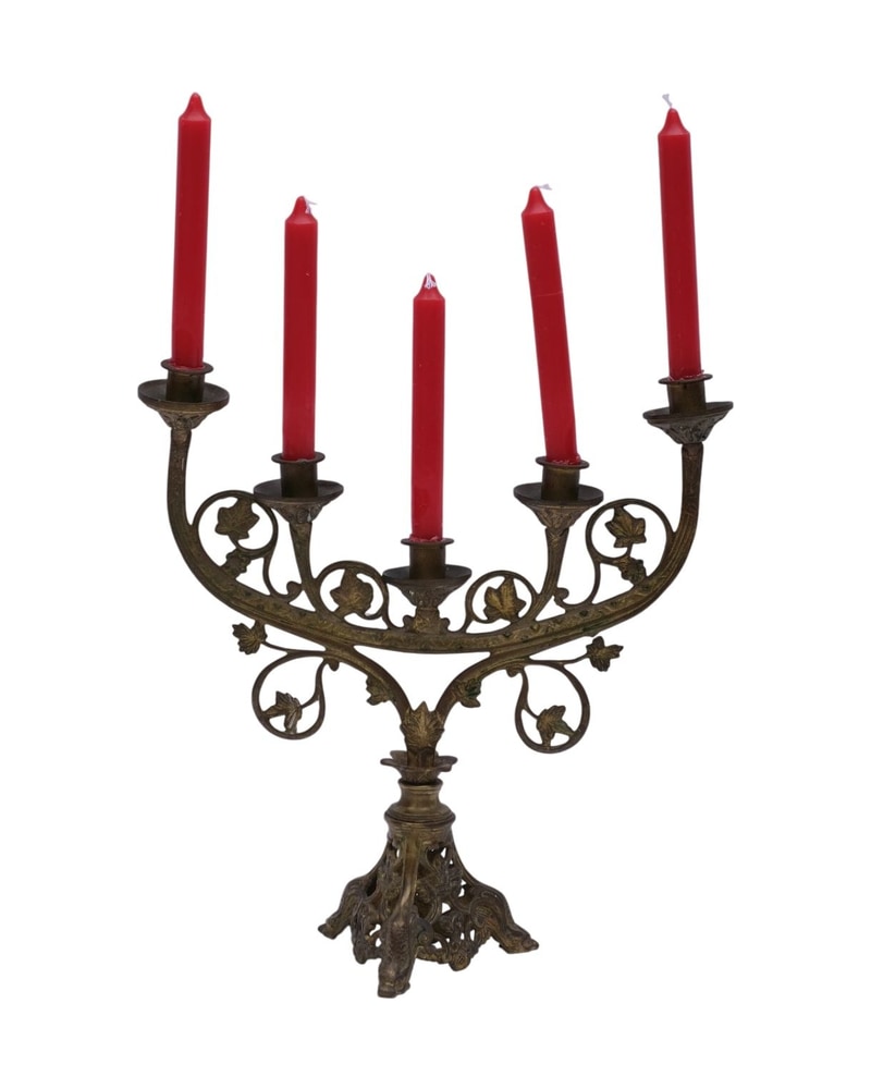 Candelabro de bronce del siglo XIX con cinco brazos para velas. Presenta un diseño decorativo con detalles de hojas en el cuerpo. La base es sólida y elaborada, mostrando un trabajo artesanal. Cada brazo sostiene un soporte para vela. El acabado tiene pátina que indica su antigüedad.