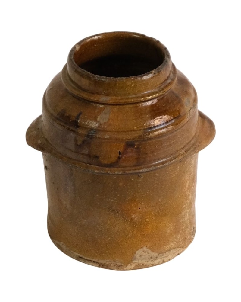Esta jarra de cerámica del siglo XIX presenta un acabado en color miel. Tiene un diseño sencillo con un borde ligeramente elevado y dos asas en los lados. La superficie muestra un ligero desgaste y algunas marcas de uso. El interior es liso y sin grietas visibles. Es un ejemplo representativo de la cerámica de su época.