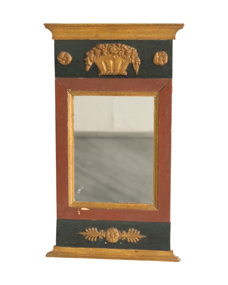 Espejo del siglo XIX con un marco decorado en tonos oscuros y dorados. Presenta un diseño neoclásico con adornos en relieve, incluyendo flores y hojas. El vidrio está en buen estado, aunque el marco muestra signos de desgaste. La parte inferior del marco está elaborada con un detalle floral en relieve. Ideal para añadir un toque vintage a cualquier espacio.