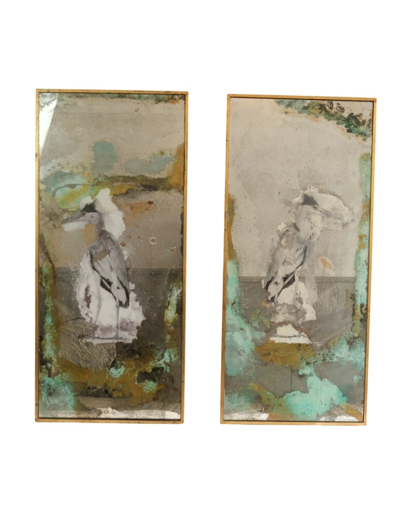 Conjunto de dos espejos decorativos del siglo XX con marcos dorados. Cada espejo presenta un diseño abstracto con tonos verdes y detalles metálicos. Los marcos son de metal dorado, aportando un contraste elegante con el vidrio. Se observan signos de envejecimiento en el acabado, lo que añade carácter a las piezas. Ideal para complementar una decoración moderna o vintage.