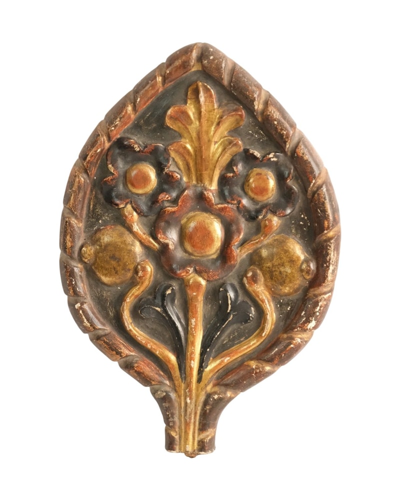 Relieve decorativo de madera tallada que presenta un diseño floral con detalles dorados. La pieza muestra un acabado en tonos oscuros y dorados, con un contorno bien definido. Las flores y hojas están cuidadosamente esculpidas, reflejando un estilo barroco. Se observan algunos signos de desgaste en la superficie, consistentes con su antigüedad. Ideal para restaurar o como elemento decorativo.