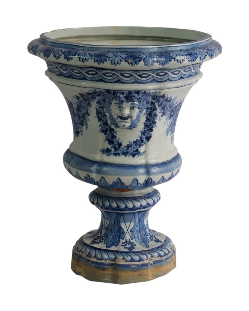 Antiguo jarrón de cerámica del siglo XIX con una base sólida y un diseño decorativo. Presenta motivos en azul que incluyen un rostro humano en relieve rodeado de flores. La parte superior es amplia y ligeramente acampanada, mientras que la base es robusta. Tiene un acabado brillante y detalles intrincados en la superficie. El jarrón muestra signos de uso y antigüedad.