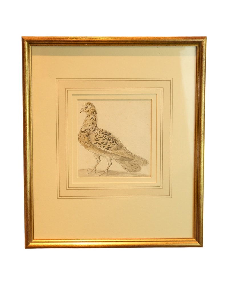 Grabado antiguo de una ave, con detalles en acuarela. Presenta un marco dorado que complementa la obra. La imagen muestra un ave con plumaje moteado, posada en una superficie. El grabado está enmarcado con un paspartú que resalta la pieza. La obra parece estar en buen estado, aunque se observan algunas marcas en el papel.