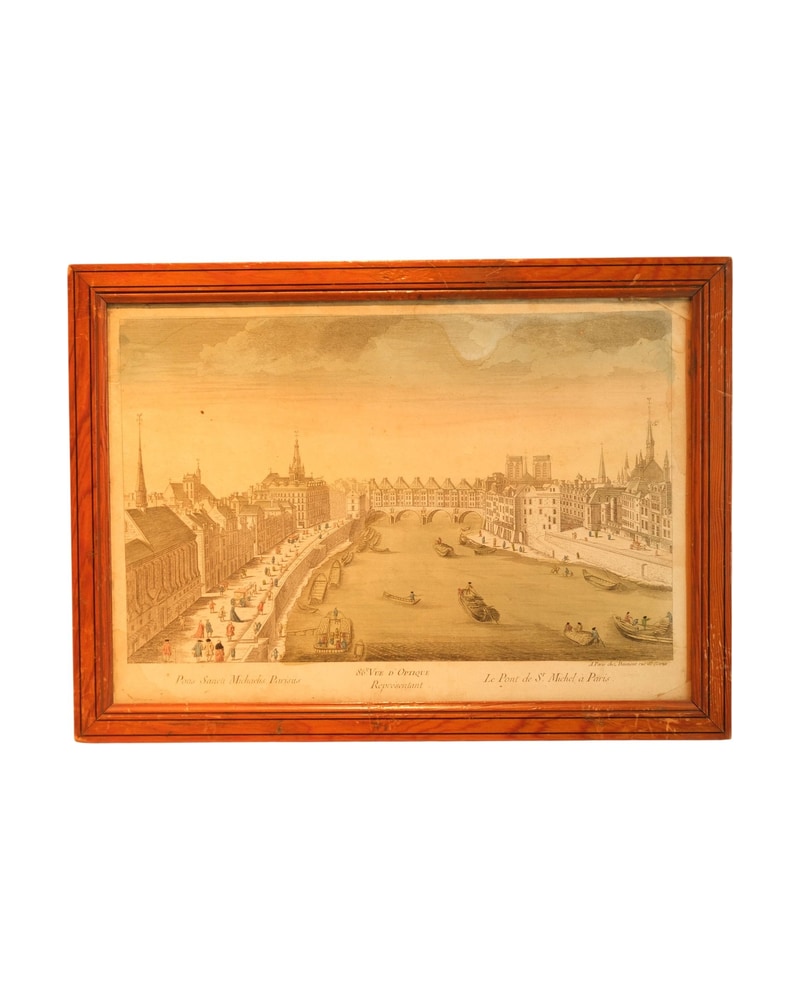 Grabado antiguo que muestra una vista del río Sena y la catedral de San Miguel en París. Presenta un marco de madera con un acabado liso. La imagen incluye detalles de la arquitectura parisina y figuras en la orilla del río. El grabado muestra un leve desgaste, consistente con su antigüedad. No se observan daños significativos en el marco.