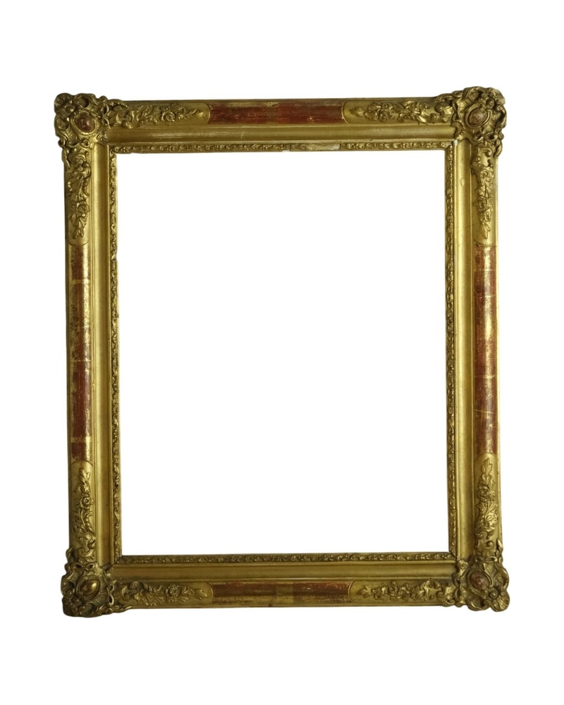 Marco de espejo en estilo barroco, caracterizado por su dorado brillante y detalles ornamentales. Presenta motivos florales y formas curvilíneas en las esquinas. La superficie muestra un leve desgaste, consistente con la antigüedad. Las uniones son visibles, pero el marco se mantiene estructuralmente sólido. Ideal para enmarcar una obra de arte o un espejo.