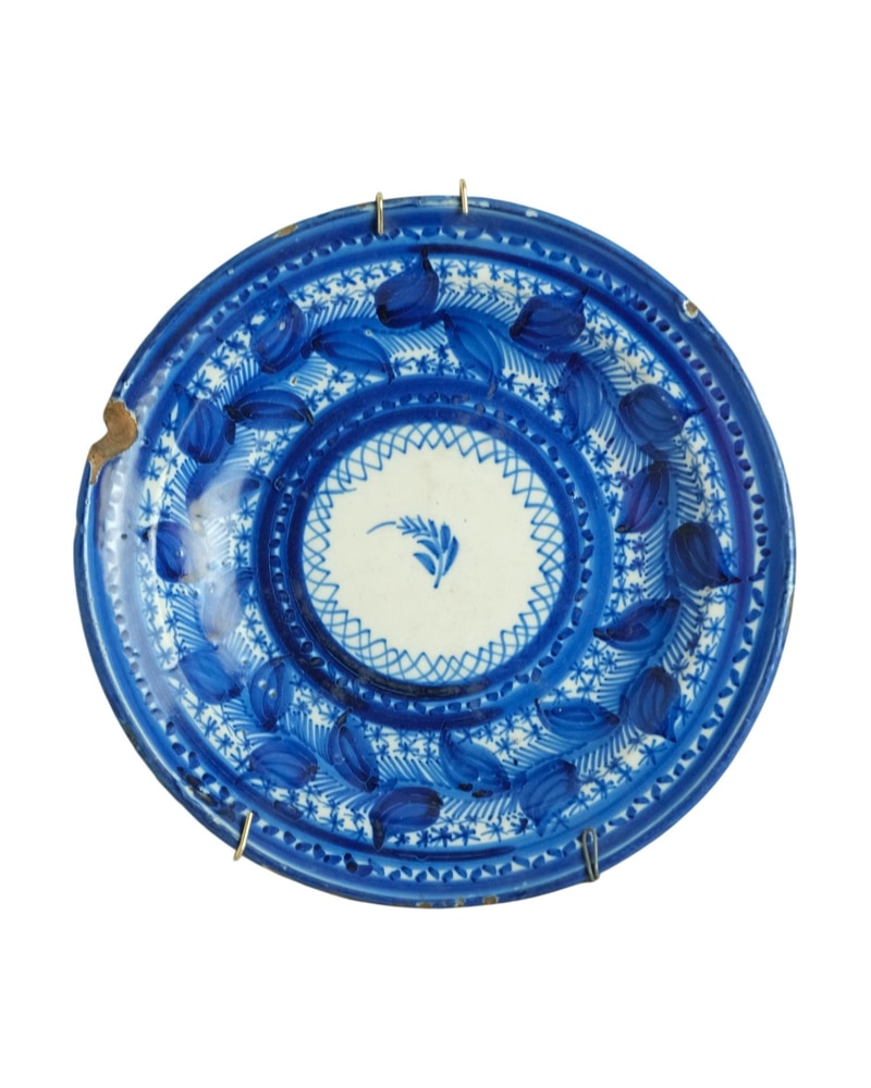 Plato ovalado de cerámica del siglo XIX con decoración en tonos azules sobre fondo blanco. Presenta un diseño de hojas y un motivo central con una espiga. Se observan algunas marcas de uso y pequeñas astillas en el borde. La parte trasera muestra un acabado simple, con un soporte metálico para exhibición. La pieza tiene un carácter artesanal y presenta un desgaste acorde a su antigüedad.