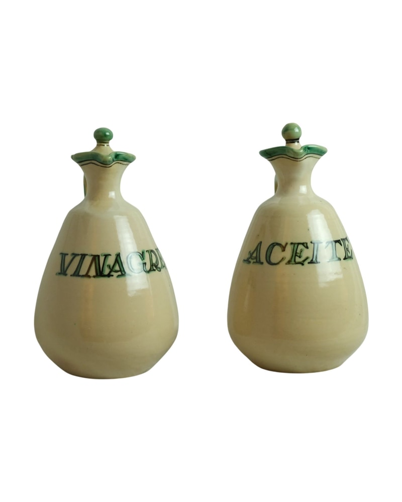 Juego de dos botijos de cerámica, uno etiquetado 'ACEITE' y el otro 'VINAGRE'. Presentan un acabado en color beige con detalles en verde. Ambos botijos tienen tapas a juego y un diseño tradicional. Las inscripciones están pintadas en letras mayúsculas. La forma es estilizada, con un cuello estrecho y un cuerpo más amplio.