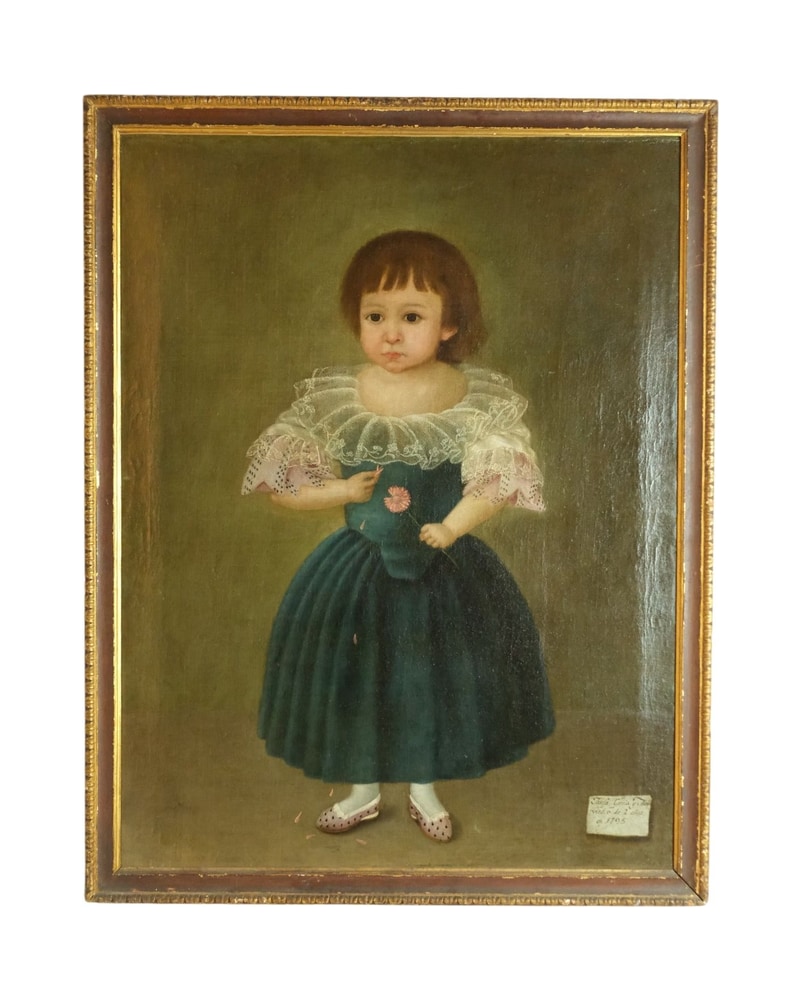 Este retrato muestra a una niña con un vestido verde y un delicado encaje en las mangas. La expresión de la niña es seria, con un toque de melancolía. El marco dorado presenta detalles en relieve. La pintura está en un estado visible de conservación, con un acabado que sugiere una técnica clásica de óleo sobre lienzo.