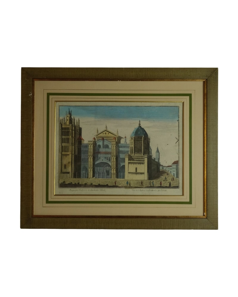 Grabado que muestra la fachada de la Catedral de Toledo, destacando su arquitectura gótica. Presenta un marco dorado con detalles en verde. El grabado incluye figuras humanas en la plaza frente a la catedral, lo que añade contexto a la escena. La obra está firmada en la parte inferior. El estado de conservación es bueno, con algunas marcas de uso en el papel.