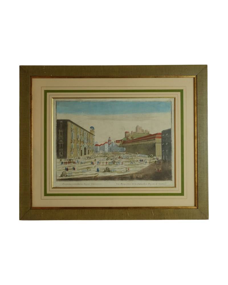 Grabado del siglo XVIII que representa la Plaza Mayor de Madrid, con detalles arquitectónicos y escenas de la vida cotidiana. Se observa un paisaje urbano con edificios de estilo barroco y figuras humanas en diversas actividades. El marco es dorado con un diseño texturizado. La obra muestra un uso de colores vibrantes y un trazo detallado que resalta la arquitectura de la época.