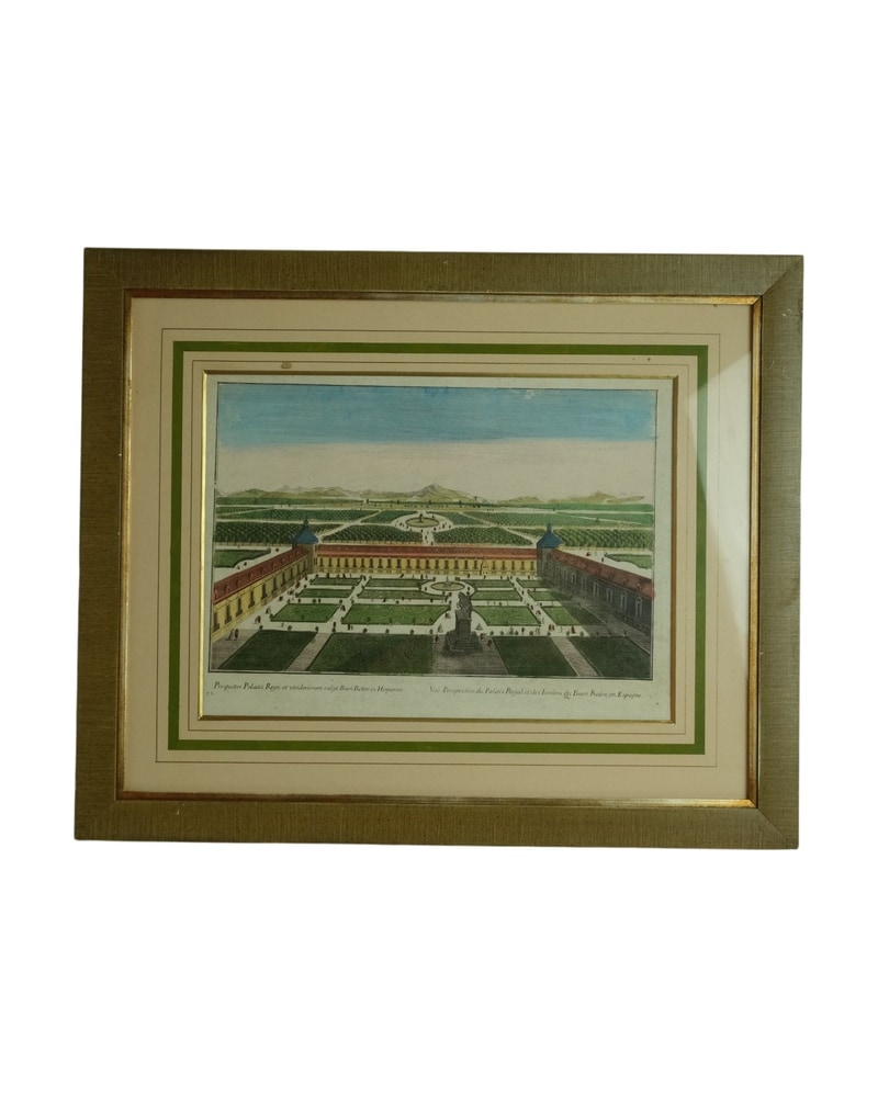 Grabado que representa el jardín del Palacio Real de La Habana, datado en el siglo XVIII. La imagen muestra un diseño simétrico con caminos, fuentes y estatuas. Los colores son vibrantes, destacando el verde de los jardines y el rojo de los edificios. El marco es dorado, complementando la obra. La impresión presenta detalles arquitectónicos y paisajísticos significativos.