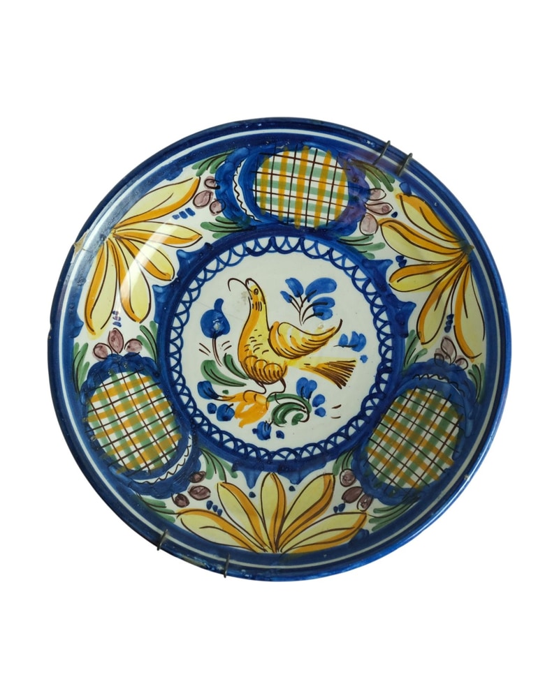 Antiguo plato de cerámica del siglo XX con un colorido diseño central de un pájaro. Presenta un borde decorado con flores amarillas y detalles en azul. La cerámica muestra un acabado brillante y un patrón de cuadros en las secciones laterales. La pieza está en condiciones visibles de uso, con un soporte de alambre en la parte posterior para exhibición.