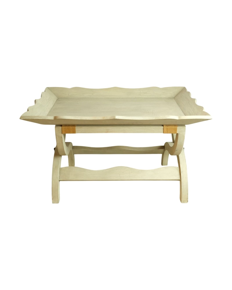 Mesa de servicio de madera clara con un diseño de borde ondulado. Presenta un acabado uniforme y una estructura sólida. La mesa cuenta con un soporte inferior que añade estabilidad. El uso de un tejido en el soporte sugiere un detalle decorativo. No se observan marcas de desgaste significativas.