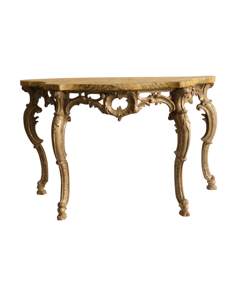 Mesa del siglo XVIII con una tapa de madera tallada en forma octogonal. Presenta patas curvadas y detalles ornamentales en los laterales. La estructura muestra un acabado en tonos claros con un diseño intrincado. Las uniones son visibles y la mesa parece estar en un estado de conservación adecuado. No se observan daños significativos en la superficie.