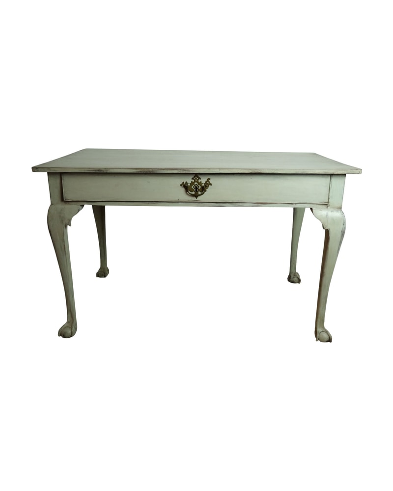 Mesa antigua del siglo XVIII con un acabado en blanco desgastado. Presenta un cajón frontal con un tirador de bronce decorativo. Las patas tienen un diseño en garra, típico de la época. La superficie muestra signos de uso, con una pátina que indica su antigüedad. Estructura sólida y funcional.