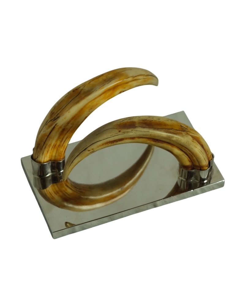 Soporte de mesa del siglo XX con mangos curvados de cuerno. La base es de metal pulido, proporcionando un contraste elegante. Los mangos presentan un acabado natural con variaciones de color. Las uniones son de metal, asegurando la estabilidad del objeto. Este soporte es funcional y decorativo, ideal para diversos entornos.