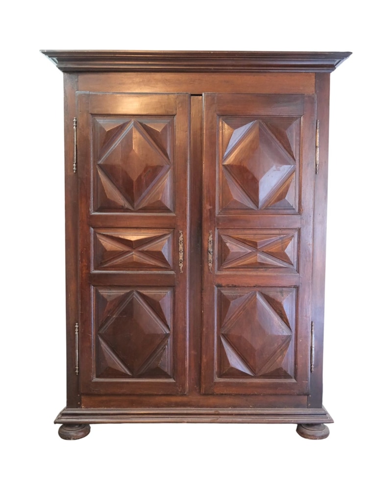 Armario rectangular con dos puertas abatibles. Las puertas están decoradas con paneles geométricos en relieve de tipo cuarterón, con motivos piramidales tallados. Presenta un remate superior con cornisa moldurada y una base sobre patas de bola. Este mueble proviene de una casa noble o Chateau Francés, mostrando una carpintería de alto nivel.
