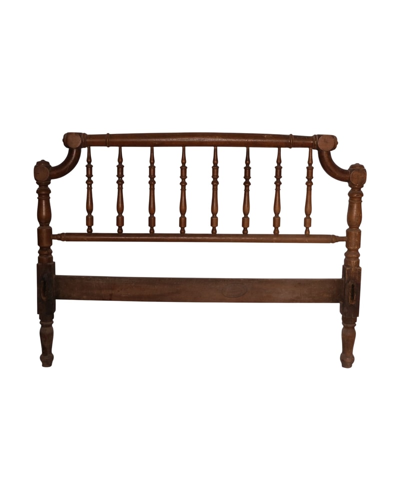 Cabecero de cama realizado en madera maciza, datable a principios del siglo XX. Presenta montantes laterales con volutas curvas y elementos torneados. La parte superior tiene una barra horizontal con barrotes verticales torneados. Se apoya sobre patas torneadas y conserva un travesaño inferior de unión. Muestra desgaste, pequeñas pérdidas y marcas del paso del tiempo. Construcción mediante técnicas tradicionales de carpintería.