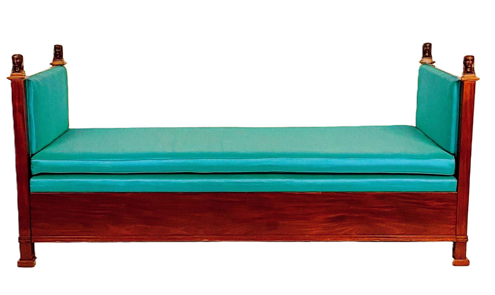 Diván de caoba sueco de alrededor de 1810. Presenta detalles de caoba chapada y tallada. La altura es de 91,5 cm, con un ancho de 196 cm y una profundidad de 78,5 cm. Originalmente, probablemente se ubicaba en una sala de música. Las terminaciones incluyen cabezales tallados que añaden un carácter distintivo.