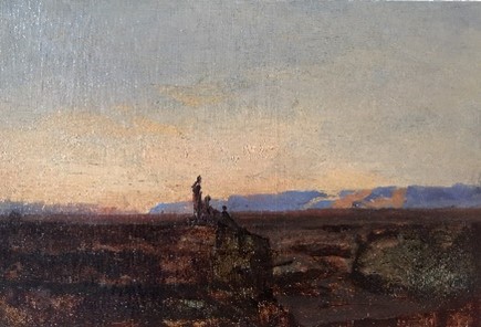 Óleo sobre lienzo de Charles François Eustache titulado 'Atardecer con mujeres egipcias recogiendo agua'. La obra mide 18,3 x 26 cm y presenta una escena de mujeres en un entorno egipcio. En el reverso, se encuentra el sello del legado del artista (Lugt 4495). Eustache fue discípulo de Prosper Marilhat y viajó a Egipto en 1842 y 1847.