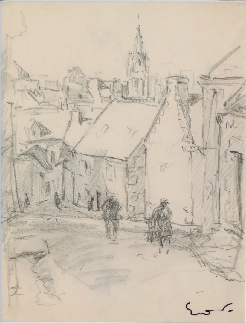 Dibujo de Othon Friesz que representa una escena callejera. Realizado en lápiz y carbón sobre papel, con dimensiones de 25.5 x 19 cm. Presenta un sello de firma en la parte inferior derecha: Eof. La obra proviene de la colección Barrie-Chevalier.