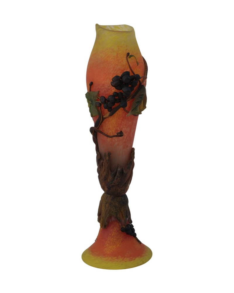 Vaso de vidrio con forma estilizada y acabado en tonos naranja y amarillo. Presenta detalles en relieve de uvas y hojas, con una base de metal que simula madera. La superficie muestra un acabado suave y un diseño fluido característico del estilo Art Nouveau. El tallado en la base añade un elemento decorativo adicional. No se observan marcas visibles del fabricante.
