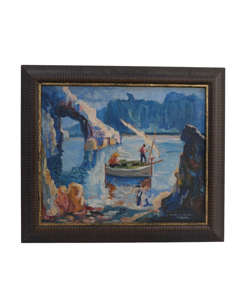 Cuadro enmarcado del siglo XX con un marco de madera que presenta detalles en relieve. El marco tiene un acabado en tonos oscuros con dorados. La parte trasera del cuadro está reforzada con madera. No se observan firmas o marcas visibles en la pintura.