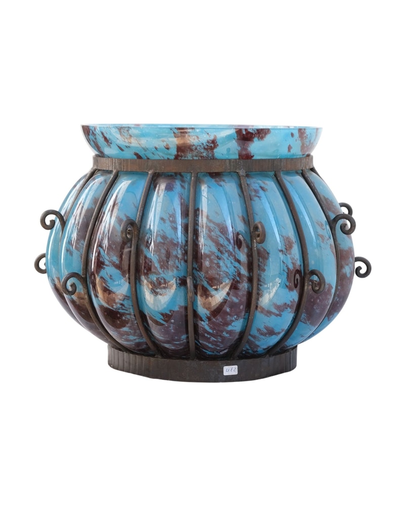 Este jarrón de vidrio presenta un diseño distintivo en tonos azules y marrones, con una forma redondeada y paneles acanalados. Está sostenido por una estructura de metal con detalles en espiral. La superficie del vidrio muestra un acabado brillante, con una mezcla de colores que aporta un efecto visual atractivo. Es un objeto decorativo ideal para complementar diversos estilos de interiores.