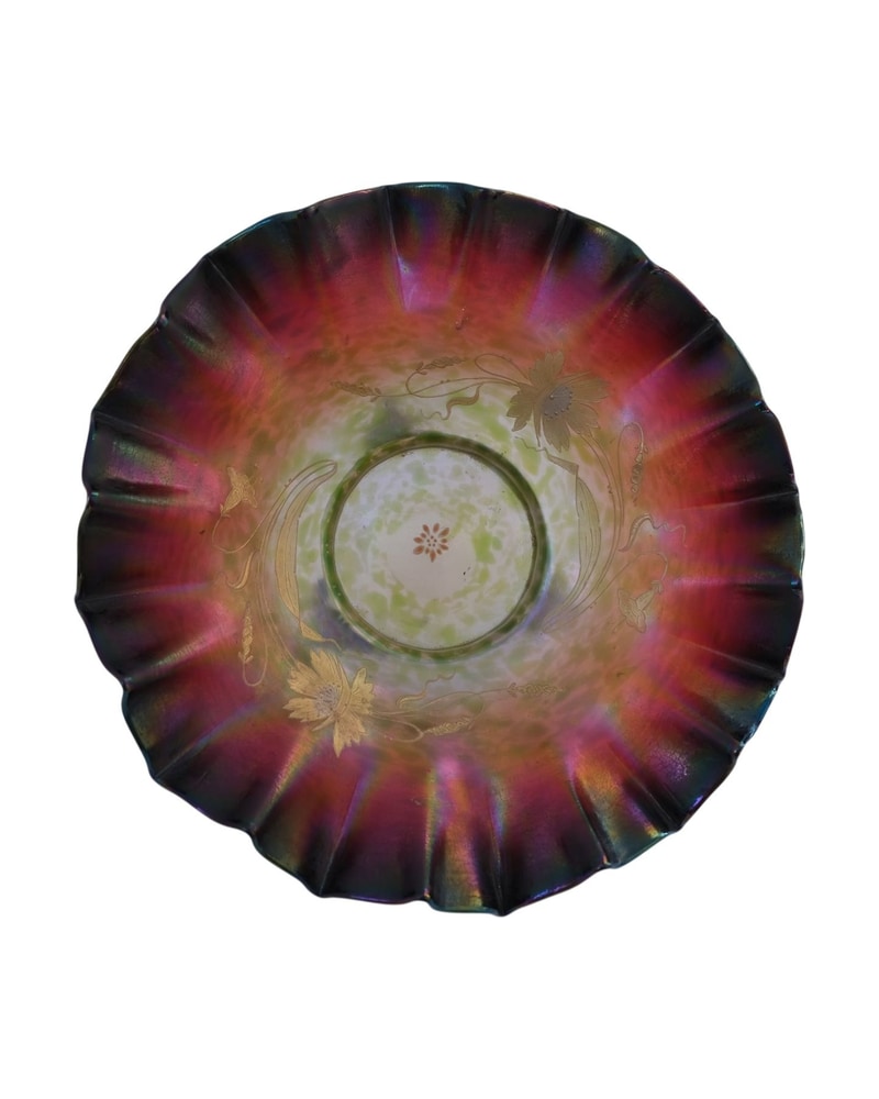 Plato antiguo de vidrio del siglo XIX con un acabado iridiscente que presenta tonos de rosa y verde. La superficie está decorada con un diseño floral dorado, visible en el borde y el centro. El plato tiene un borde ondulado, lo que añade un carácter distintivo. No se observan marcas visibles de fabricante. Presenta ligeros signos de uso, pero en general está en buen estado.