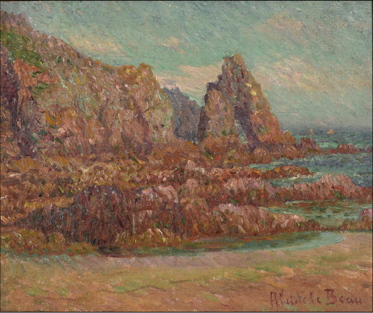 At the beginning of his career, he joined the Pont-Aven painters, but instead of Gauguin and Bernard's cloisonism, he chose the Breton Impressionism perfected by Henry Moret, Maxime Maufra and Gustave Loiseau, which is characterised by strong colours and complementary contrasts. This impressionist-style painting depicts the Côte Sauvage, the wild coast, a picturesque coastal formation full of rocky cliffs and hidden beaches. It is located in the Loire-Atlantique department on the Atlantic Ocean off the Guérande peninsula and stretches to the bay of La Baule. Le Beau captured the rugged landscape in shades of pink, blue and green, which he applied with energetic, vibrant brushstrokes. The use of ‘Rose Moret’, the motif and the painting style are reminiscent of Henry Moret, whose works Le Beau's paintings can rival. His painting shows the coast in sunshine and calm seas, but focuses on the rocks rugged by the crashing waves. Like Moret, he focused on the contrast between radiant beauty and the wild relentlessness of nature, so typical of Brittany, and joined the ranks of the great painters of Breton Impressionism.