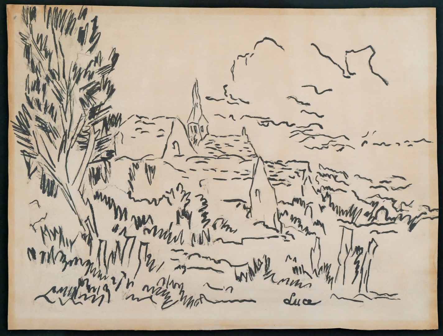 Dibujo de Maximilien Luce titulado 'El Pueblo de Rolleboise'. Realizado en tinta negra y lápiz sobre papel, mide 24 x 30 cm. La obra está firmada en la parte inferior derecha: Luce. Presenta un paisaje con casas y un árbol en primer plano, capturando la esencia del pueblo.