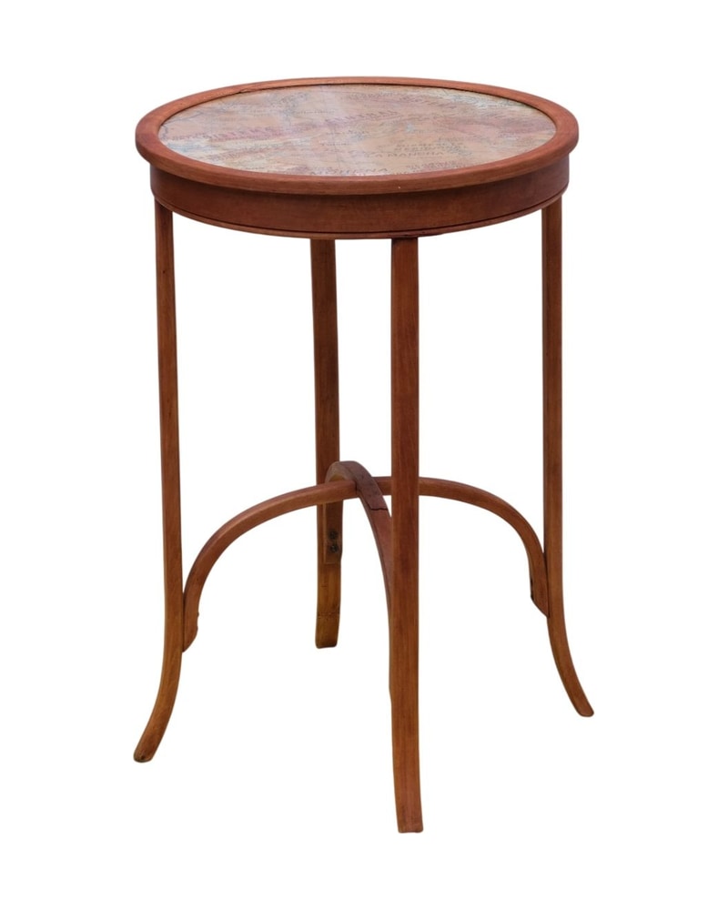 Mesa de siglo XX hecha en el estilo Thonet con madera curvada de haya. La tapa de la mesa es de cristal que se puede desatornillar para cambiar el diseño de debajo. La madera está decapada y acabada con cera.