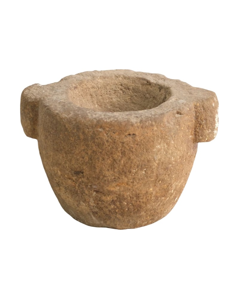 Mortero de piedra de construcción sencilla. Presenta desgaste notable con marcas y decoloraciones. No se observan reparaciones visibles.