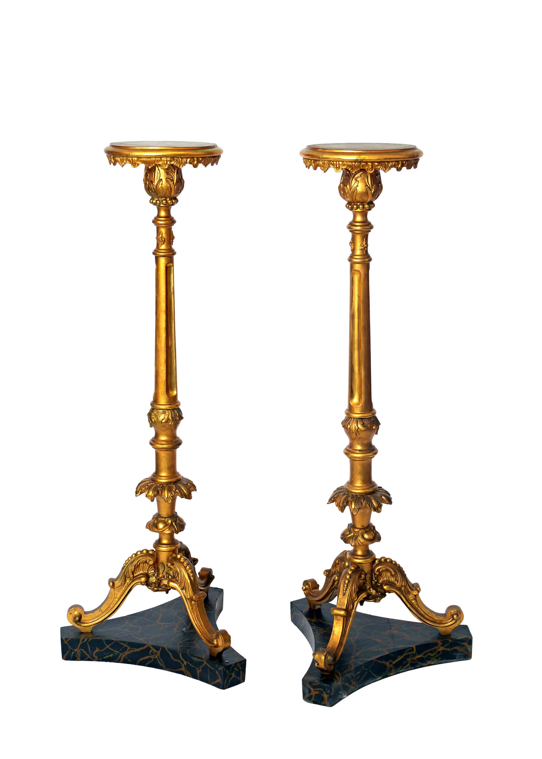 Par de torchères de estilo neoclásico, fabricadas en madera tallada y dorada. Presentan una base de madera pintada y veteada, con detalles ornamentales en la parte superior. La altura es de 133 cm, con un diámetro de 46 cm en la parte superior. Las torchères muestran un diseño elegante y refinado, adecuado para diversas decoraciones interiores. Están en buenas condiciones, con signos de uso acordes a su antigüedad.
