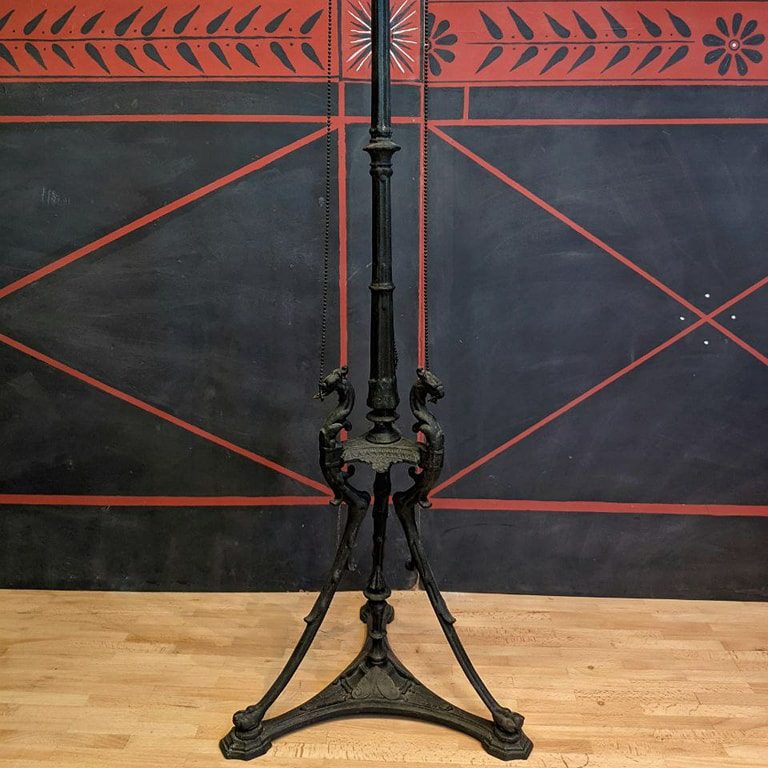 Postament de hierro fabricado alrededor de 1860. Este objeto fue inspirado por la estatua trípode 'Isis Tripod', descubierta en el Templo de Isis en Pompeji. Presenta un diseño elegante con detalles ornamentales en la base y un soporte vertical robusto. La altura es de 98 cm y el diámetro de la base es de 34 cm. La estructura muestra un acabado original, con signos de uso que no afectan su estabilidad.