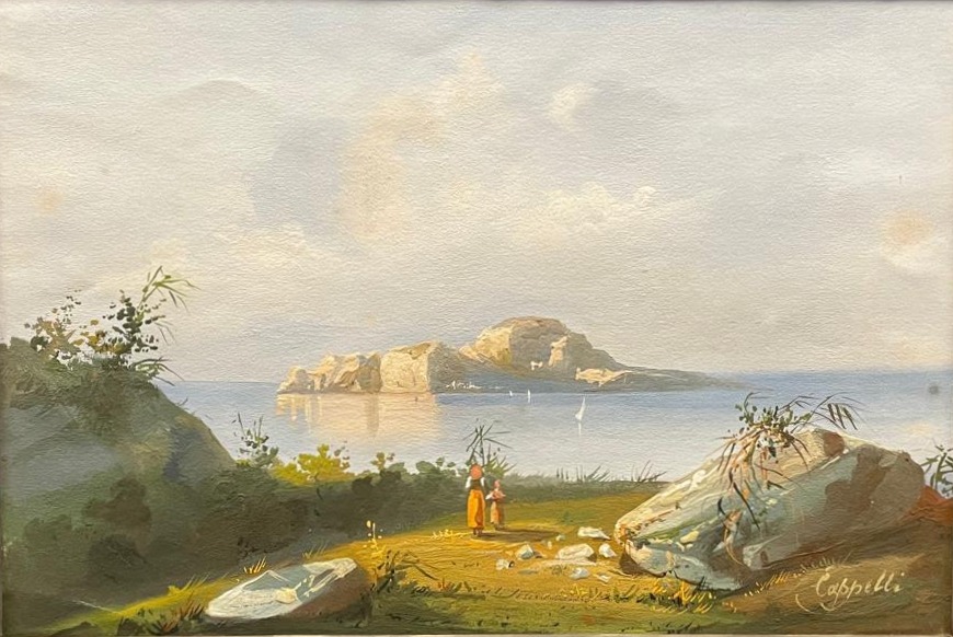 Obra en gouache sobre papel que muestra un islote rocoso en la costa mediterránea italiana. Las dimensiones son 22 x 32 cm. Presenta un paisaje sereno con figuras en primer plano. La técnica de gouache permite una rica paleta de colores y detalles en la representación del agua y la vegetación. El marco es sencillo y complementa la obra.