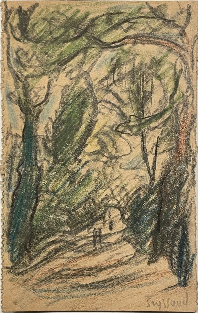 Dibujo de René Seyssaud titulado 'Im Unterholz'. Realizado en buntstift sobre papel, mide 10 x 6 cm. La obra está firmada en la esquina inferior derecha: Seyssaud. Presenta un paisaje con árboles y un camino, característico del estilo del autor.