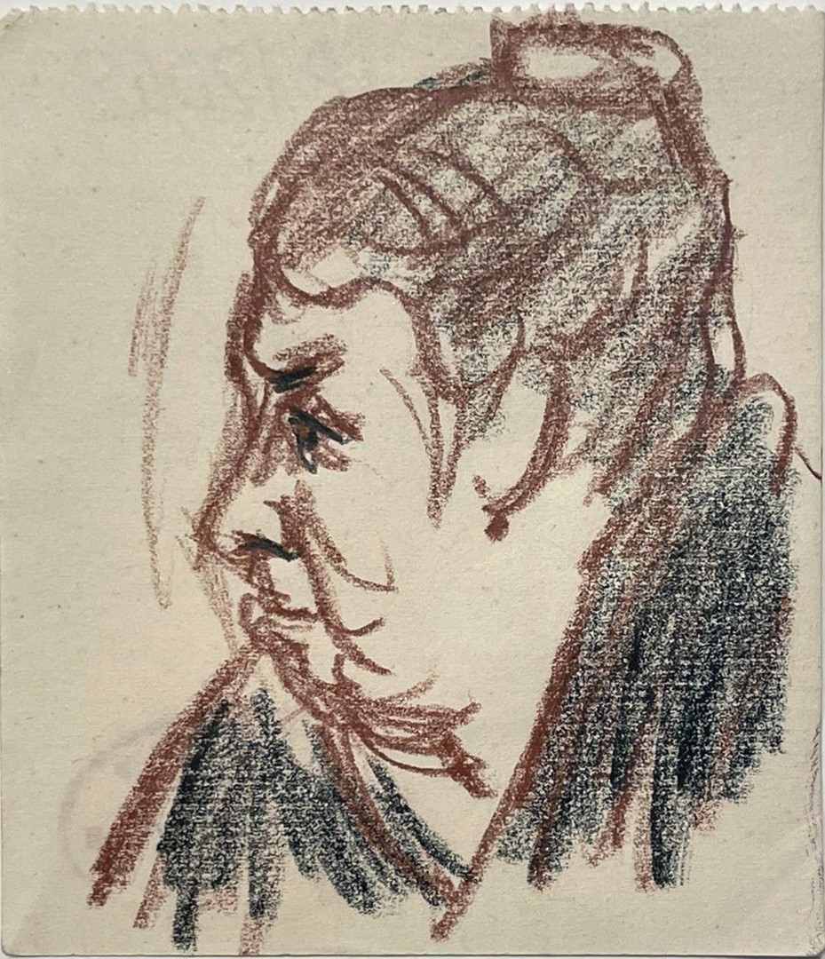 Retrato de una mujer mayor realizado en lápiz de color sobre papel por René Seyssaud. La obra presenta un estilo expresivo con trazos visibles y un uso interesante del color. En la parte posterior se encuentra el sello del taller del artista con el número 0143. La pieza está enmarcada, lo que realza su presentación.