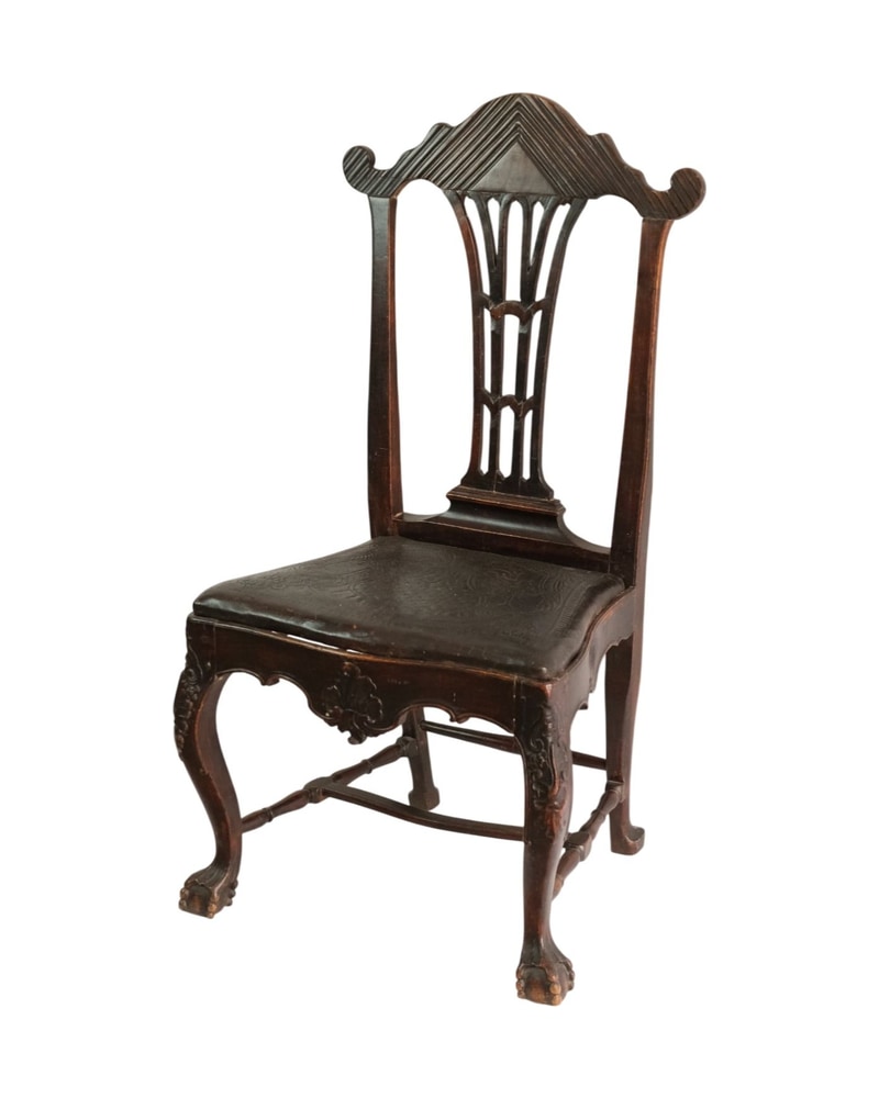 Silla de respaldo abierto del siglo XVIII, originaria de Inglaterra. Fabricada en madera tallada, posiblemente caoba, presenta un diseño elegante con respaldo y patas cabriolé. El estado muestra desgaste visible en la superficie, especialmente en el asiento, con algunas reparaciones menores y pérdida de acabado. La calidad de la talla es buena, pero el desgaste y las reparaciones afectan su integridad. Requiere conservación para mantener su estado.