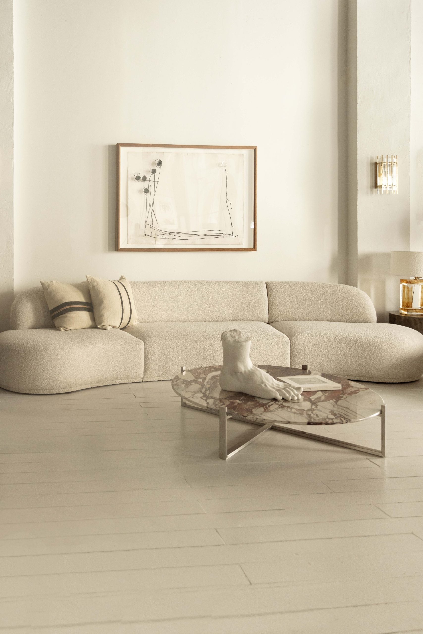 El sofá modular MZ.05 presenta una estructura de madera de pino y haya. Los asientos y respaldos están hechos de espuma de alta densidad. Está tapizado en un tejido semi bouclé ligero. Su silueta curva aporta textura y calidez al ambiente. Esta pieza es parte de la Colección Mestizo, diseñada y fabricada de manera artesanal. Permite personalización en medidas y acabados.